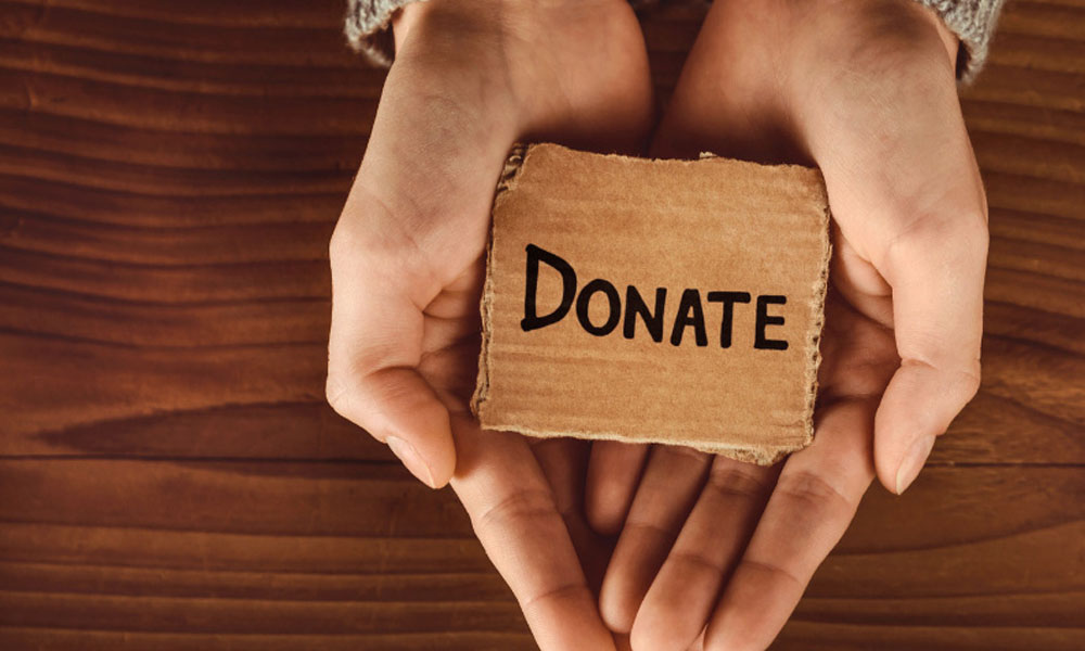 - Images of transparent boxes labeled “Donations” filled with money, clothes, or food.